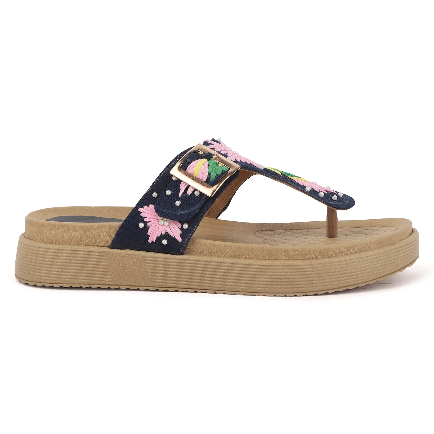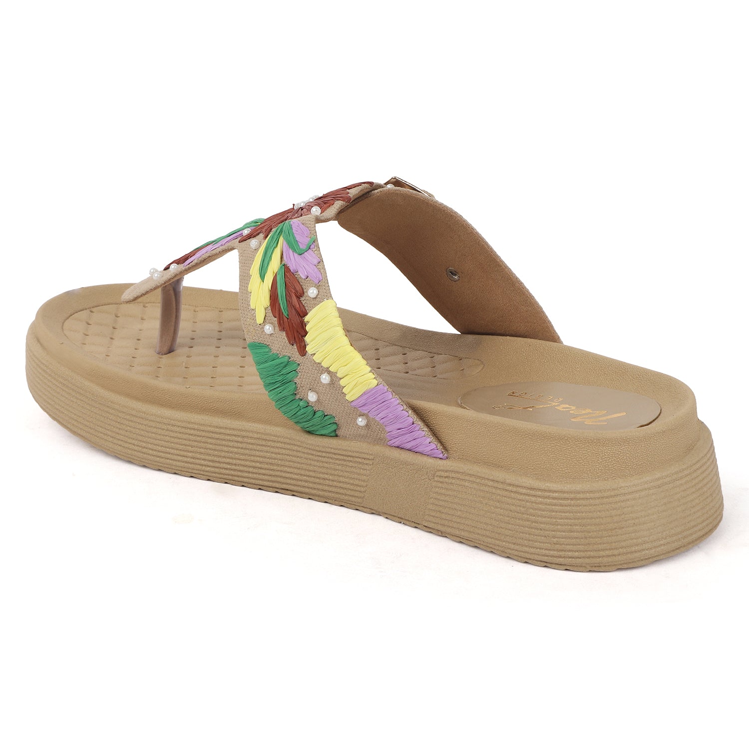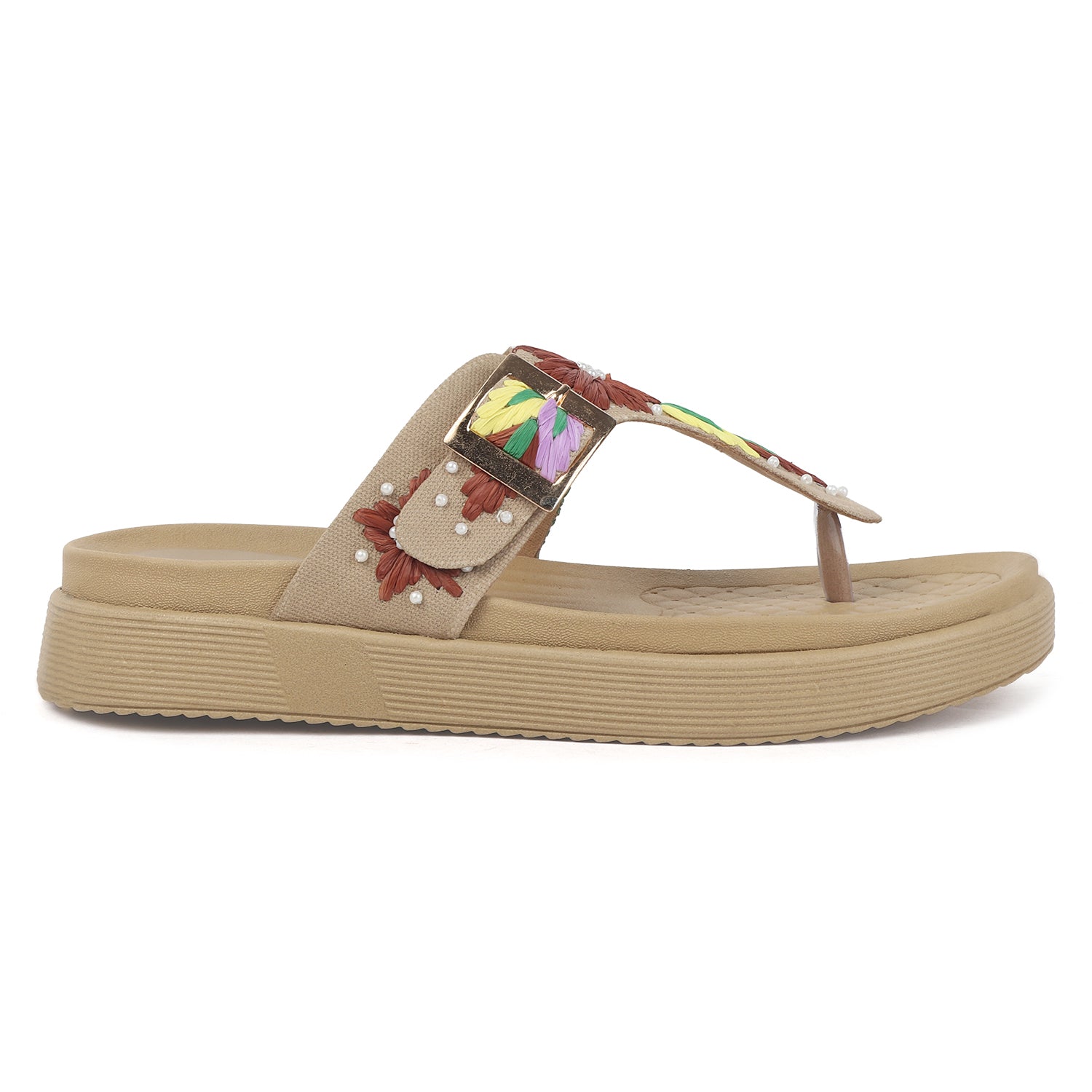 Radiate sunny-day charm with these beige T-strap sandals, adorned with bold floral embroidery in rich red, green, yellow, and lilac hues. Delicate pearl accents add a touch of elegance, while the gold-tone buckle and cushioned sole ensure both a secure fit and all-day comfort.