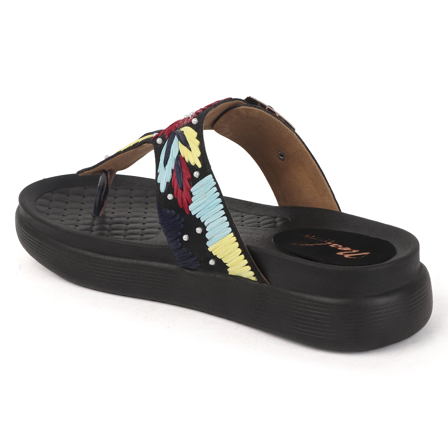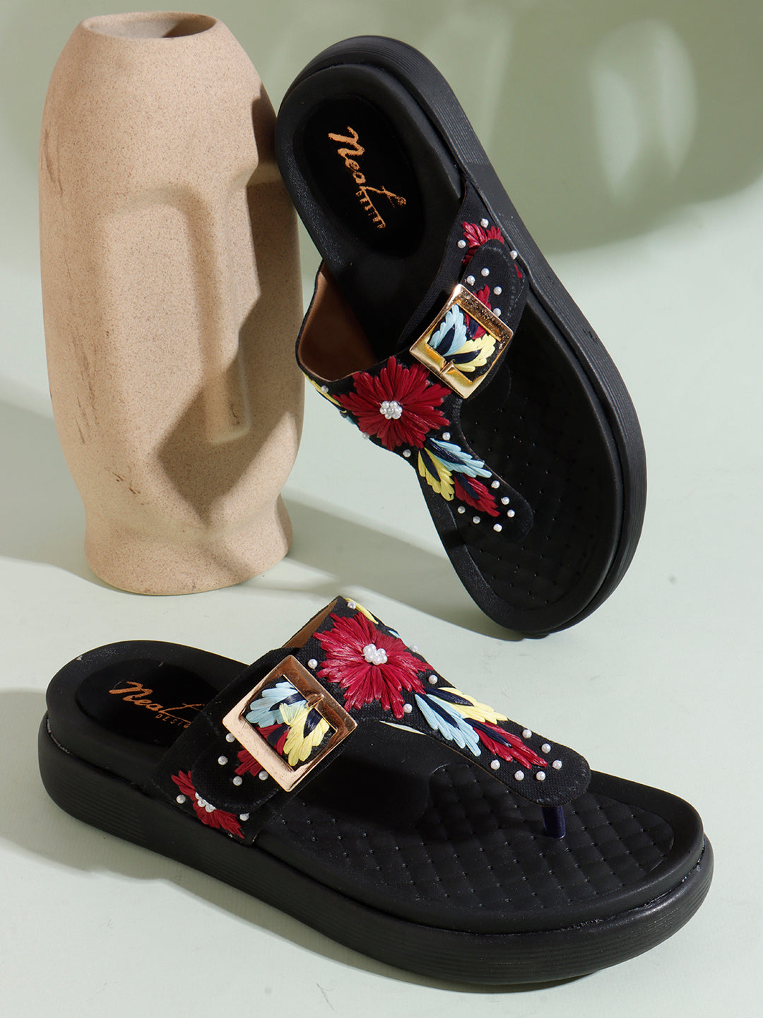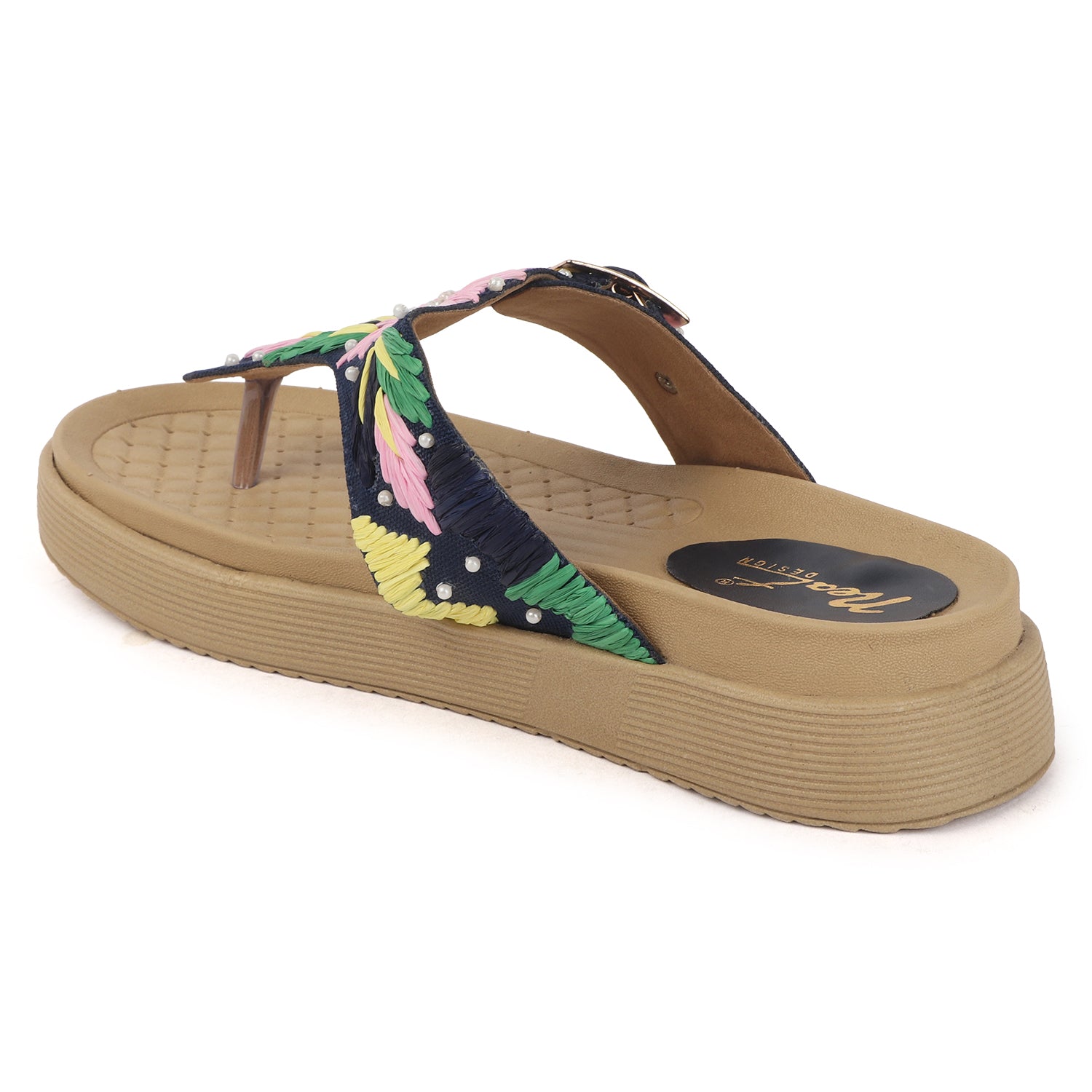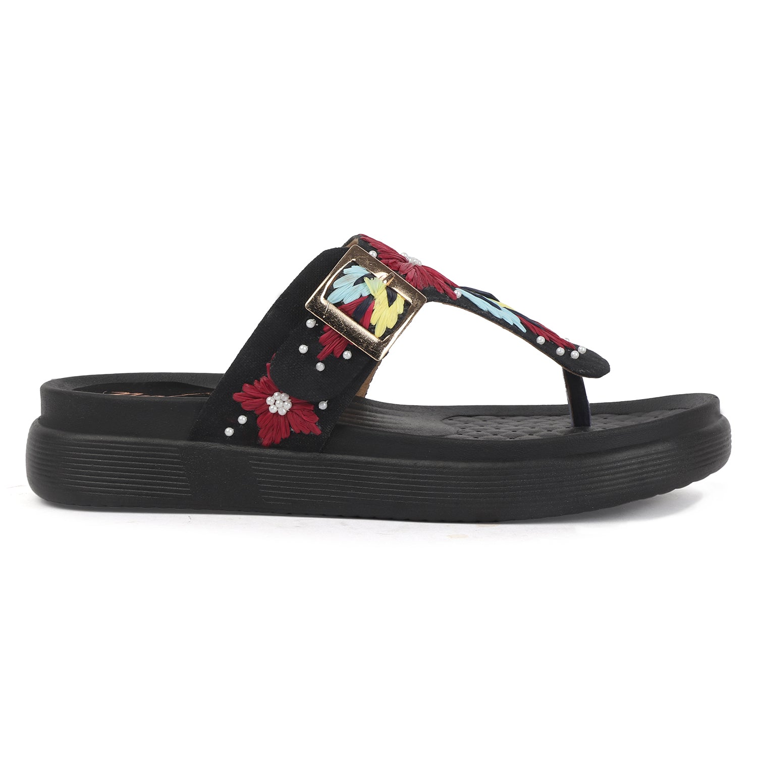 Radiate sunny-day charm with these beige T-strap sandals, adorned with bold floral embroidery in rich red, green, yellow, and lilac hues. Delicate pearl accents add a touch of elegance, while the gold-tone buckle and cushioned sole ensure both a secure fit and all-day comfort.