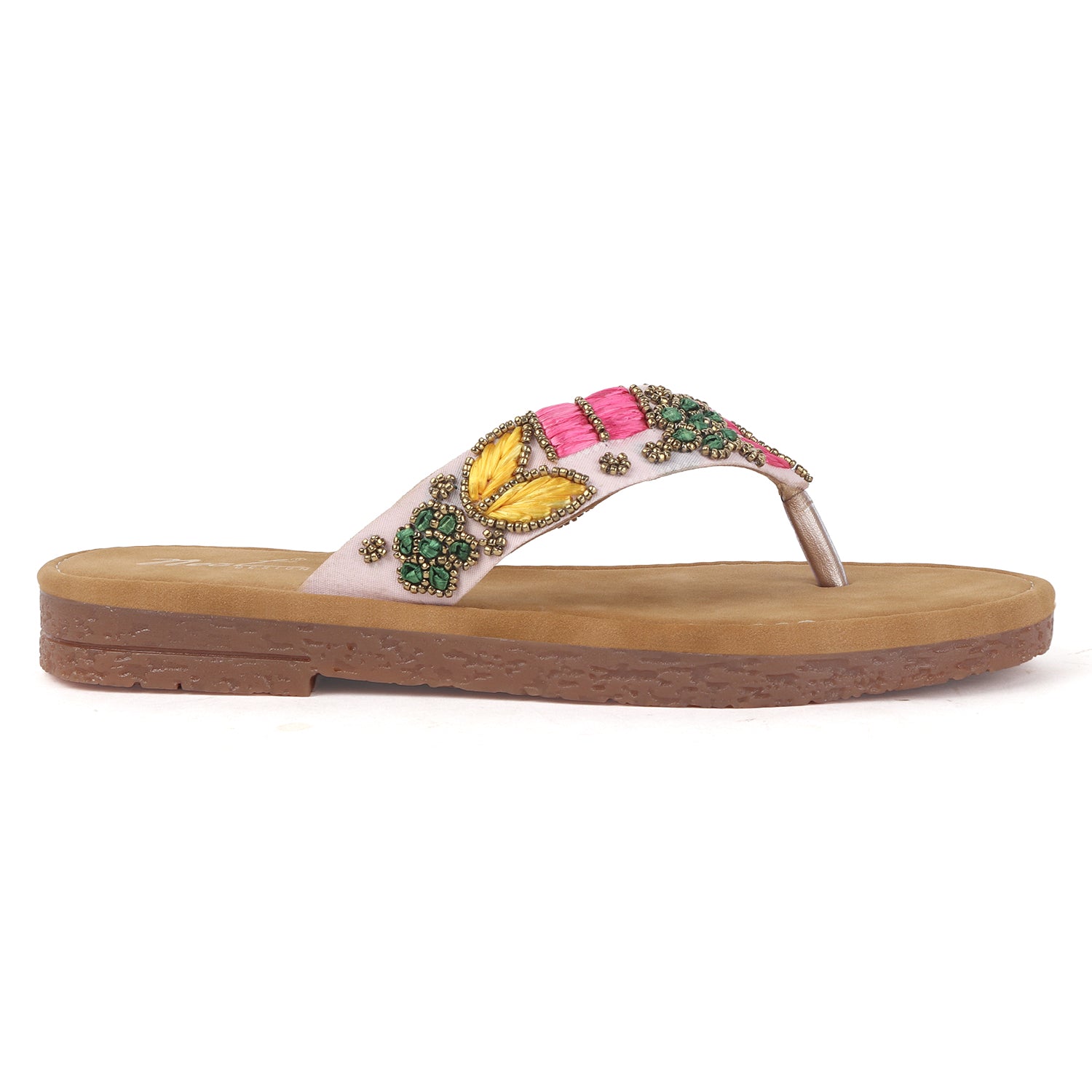 Step into artistry with these handcrafted embroidered flats, featuring vibrant floral beadwork in pink, yellow, and turquoise on a sleek black strap. The plush tan footbed offers all-day comfort, while the intricate detailing adds a touch of bohemian elegance to any outfit.