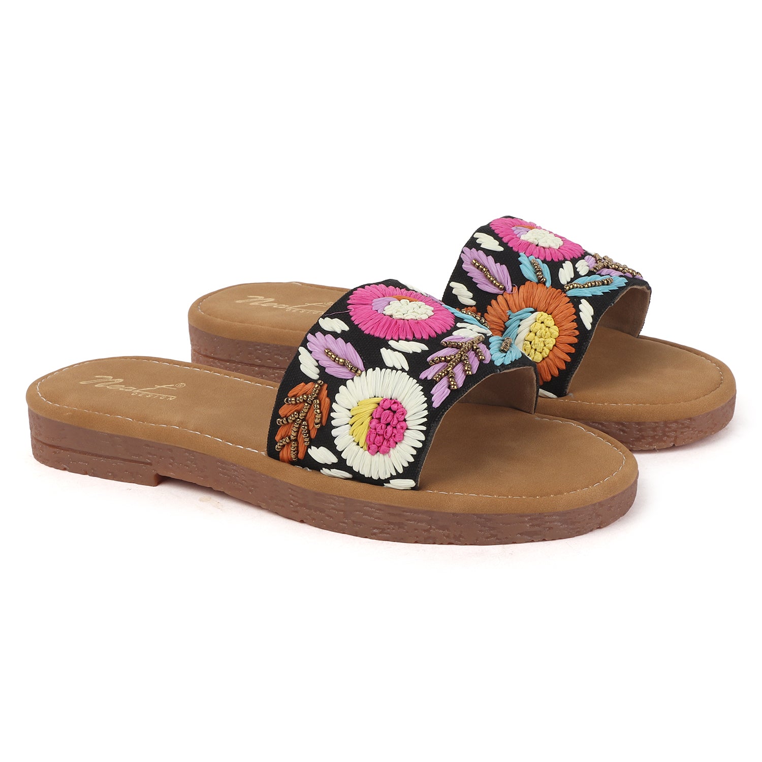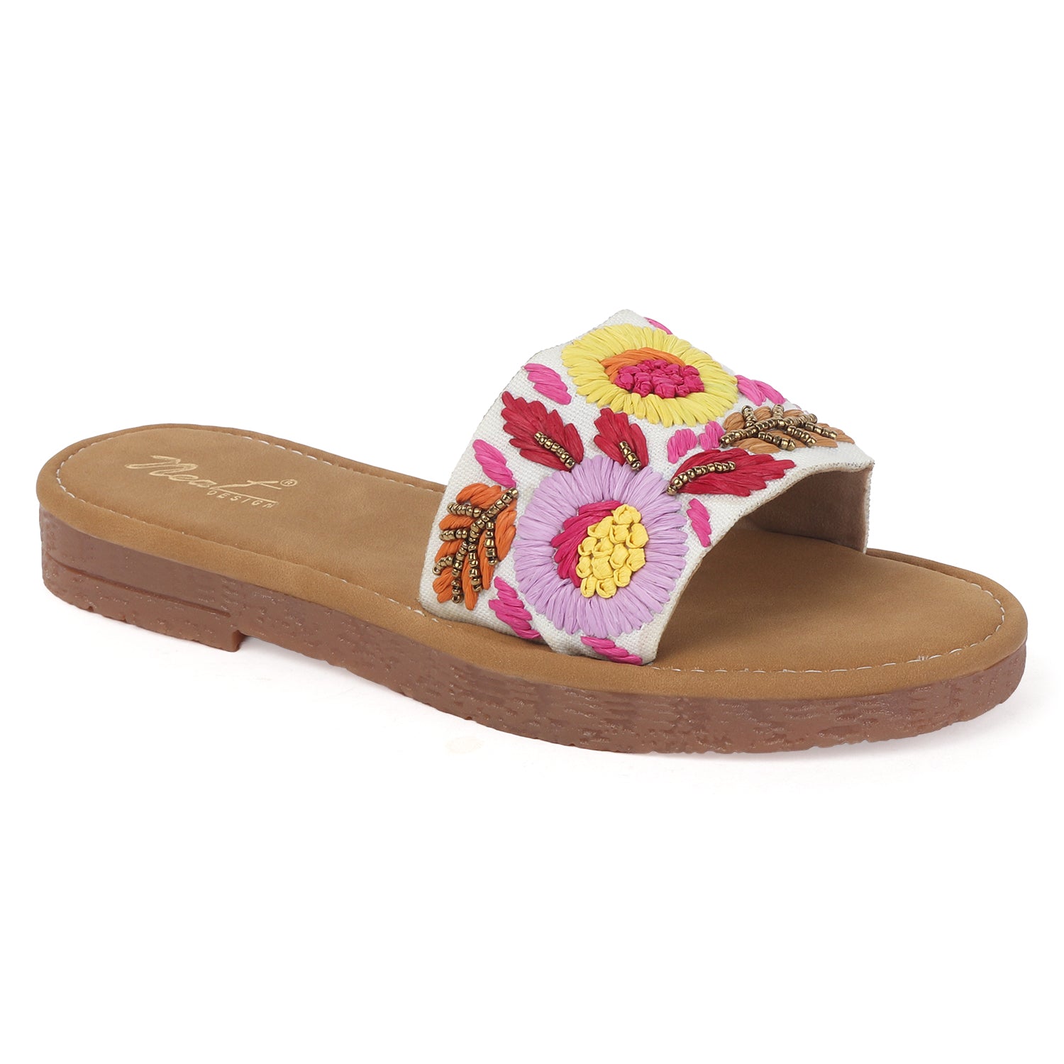 Brighten every step with these open-toe slip-ons, featuring a wide white strap adorned with bold, hand-embroidered florals in cheerful yellow, pink, lilac, and red tones. Accented with golden beadwork and set on a cushioned tan footbed, they bring the perfect blend of comfort and colourful charm