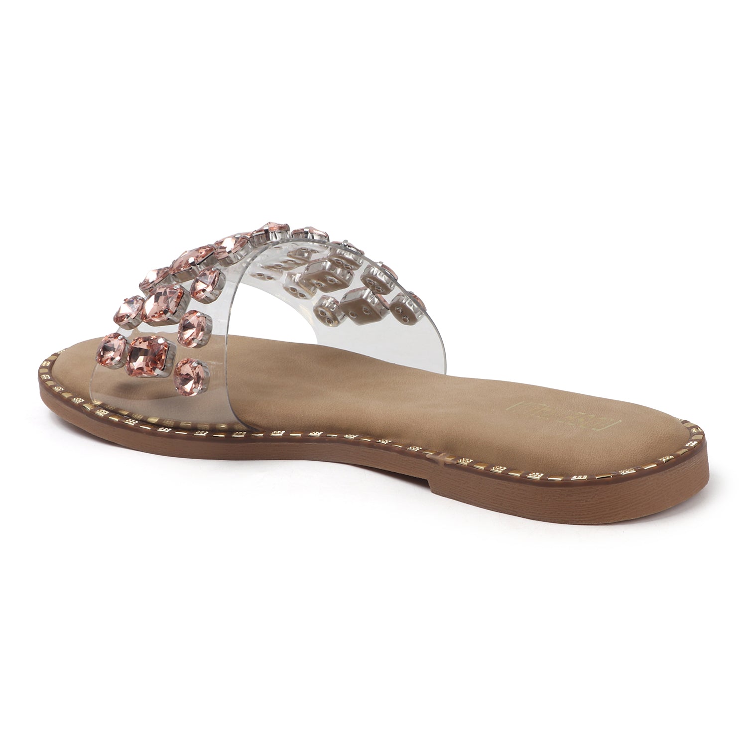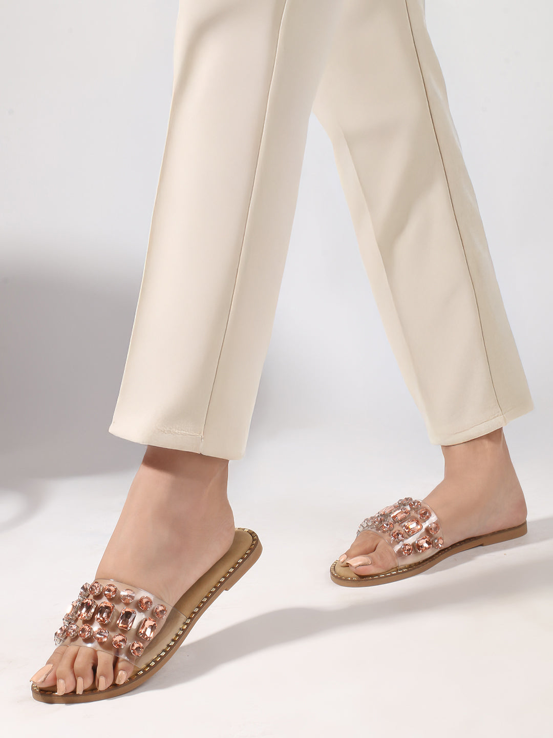 Step into effortless elegance with these crystal-embellished slip-ons. Designed with a transparent strap adorned with dazzling gemstones, this chic pair adds instant glamour to any outfit. The cushioned sole ensures all-day comfort, while the shimmering detailing around the edges makes every step sparkle. Perfect for parties, festive occasions, or simply elevating your everyday look.