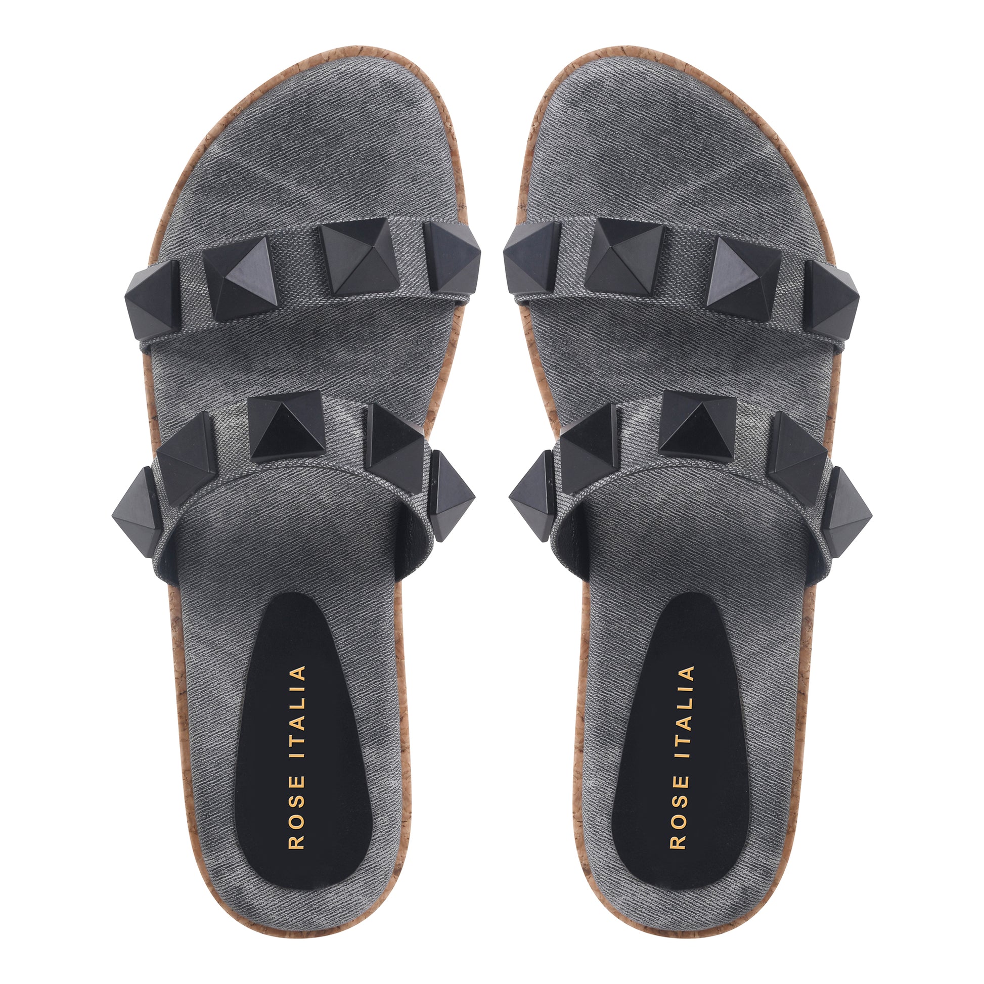 This style is a chic and contemporary flat sandal that blends simplicity with bold detailing. It features dual wide straps across the foot, each embellished with geometric pyramid studs that give the pair a striking and modern edge. The square-toe silhouette paired with a natural-toned sole keeps the design minimal yet fashion-forward. Perfect for both casual and semi-dressy occasions, this style offers a balance of comfort and trendiness, making it easy to pair with summer dresses, denim, or even chic evening outfits