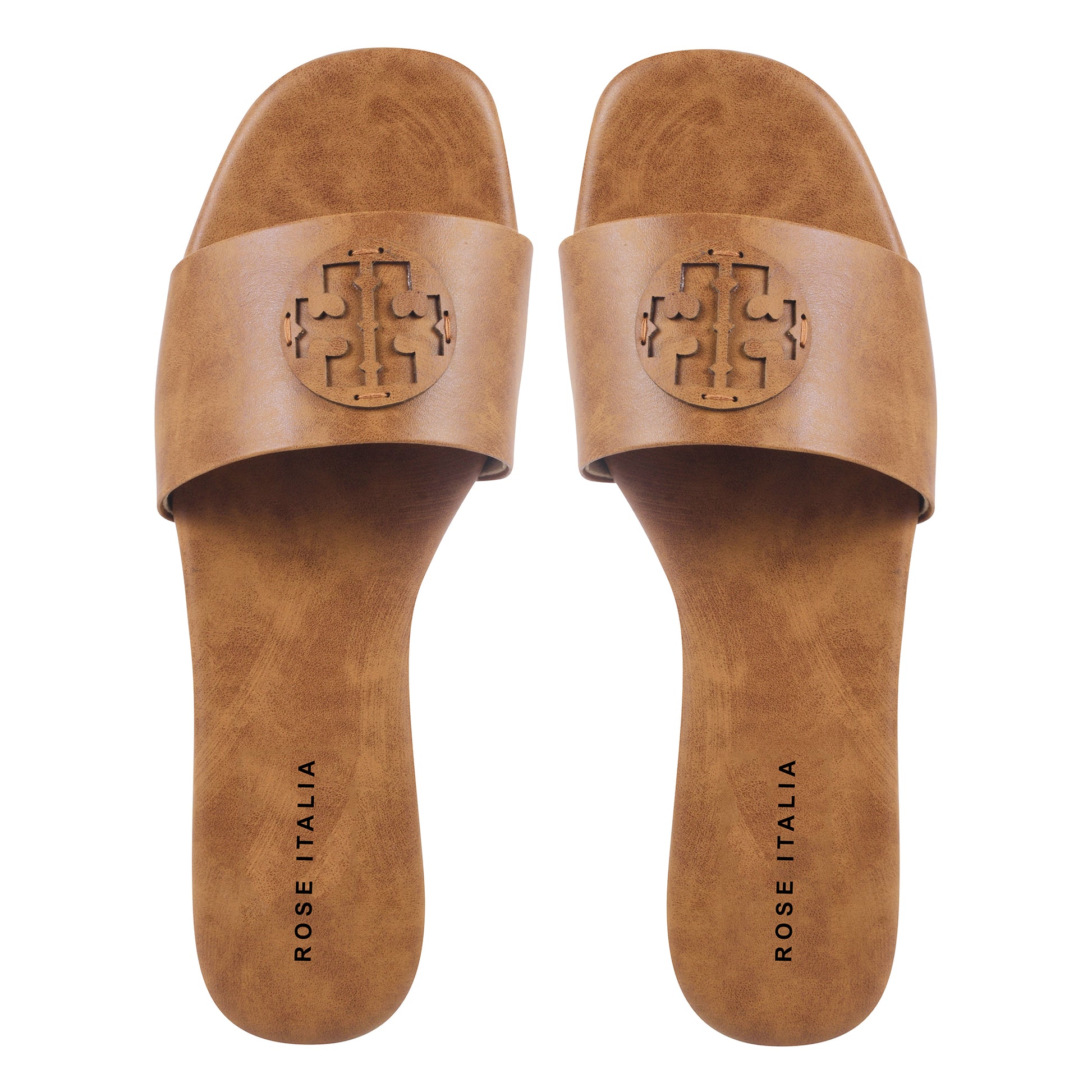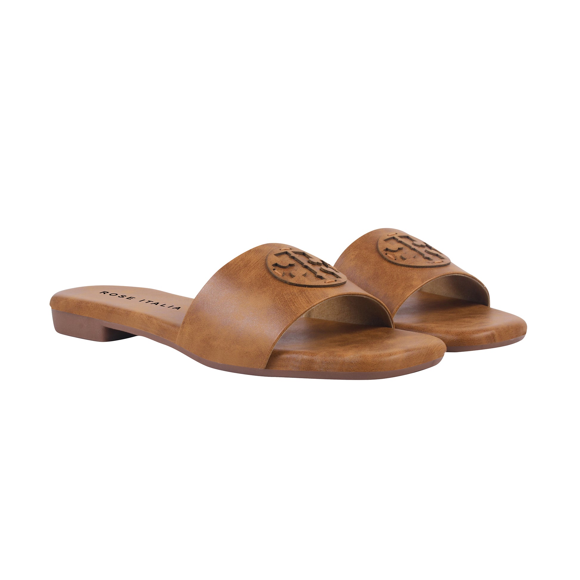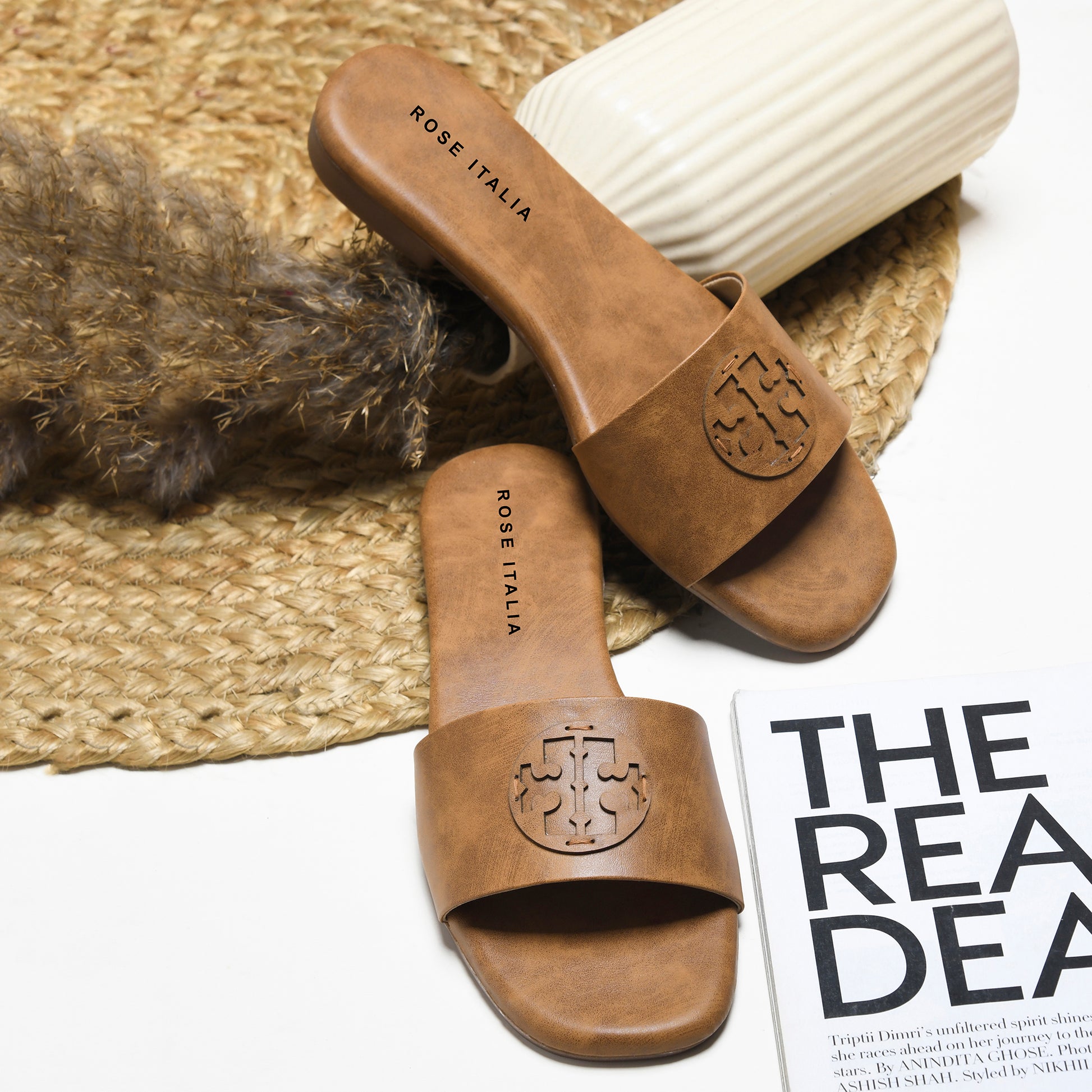 A wide strap embellished with a bold cut-out metallic emblem, they strike the perfect balance between minimalism and luxury. The sleek silhouette and cushioned footbed ensure comfort, while the timeless finish makes them a wardrobe essential—ideal for both casual chic and semi-formal outings.