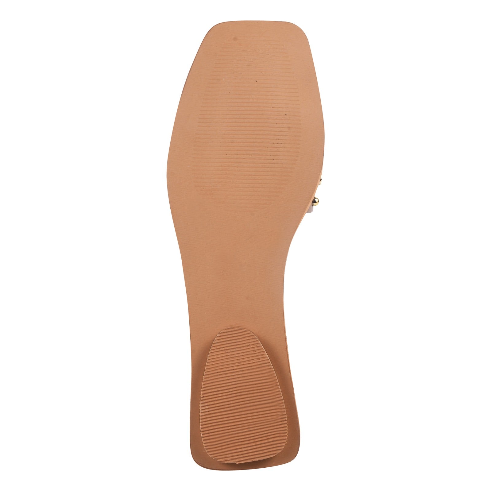 This style features a modern flat sandal designed for both elegance and comfort. The footwear has a square-toe base with a neutral tan sole, making it versatile and easy to pair with different outfits. Perfect for casual outings or chic summer looks, this design balances minimalist sophistication with a trendy edge. The stud detailing brings a statement vibe, while the clean white finish ensures it complements both everyday wear and dressier ensembles